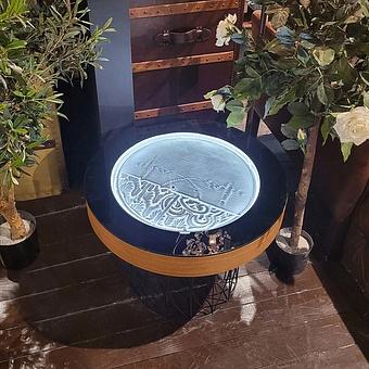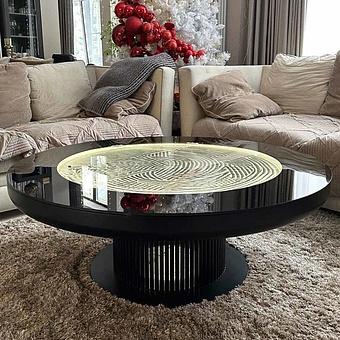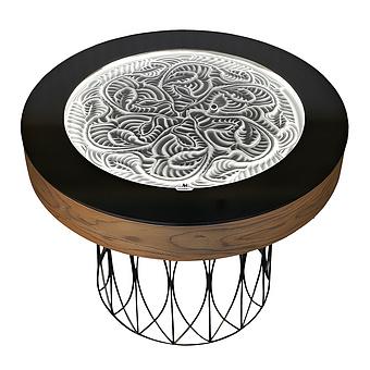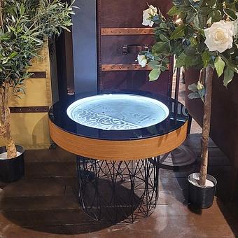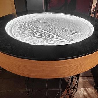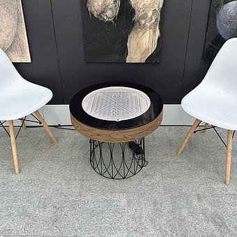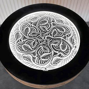 Кинетический стол - это медитативное устройство, создающее бесконечные песчано-графические композиции. Под закалённым стеклом столешницы движется стальной шарик, бесконечно рисуя орнаменты на песке. Это произведение искусства сочетает в себе инновации микроэлектроники, кропотливый труд профессионального мастера-деревообработчика, а также творчество художников и дизайнеров.