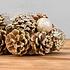 Шишки, покрытые золотистой краской, в которых установлены стеклянные подсвечники, напоминают о заснеженном лесу, хрусте снега под быстрыми лыжами и ослепительном зимнем солнце, бьющем прямо в глаза.