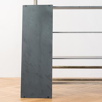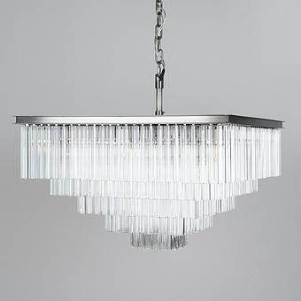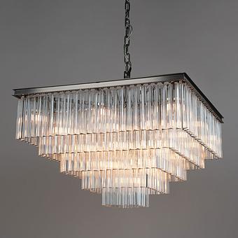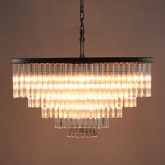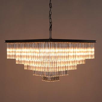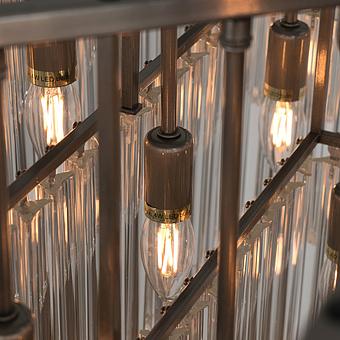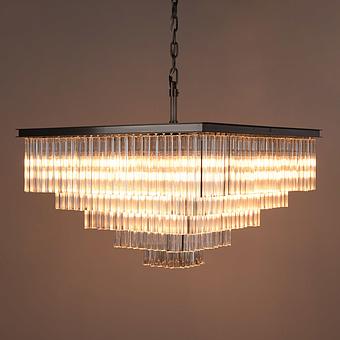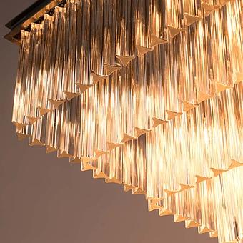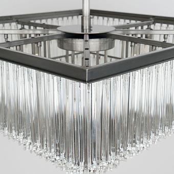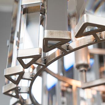 Четыре яруса, на которые нанизаны прямоугольные пластины из тонированного стекла, образуют сложную форму перевернутой ступенчатой пирамиды. Пластины, как оптические линзы, собирают, преломляют и рассеивают свет, создавая эффектные узоры на полу, мебели и других деталях интерьера.