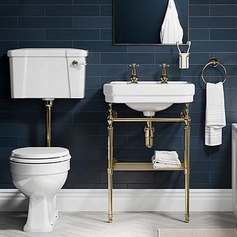Стильный и практичный держатель с ёршиком сочетает в себе элегантный дизайн, позолоченную латунную отделку и белоснежную керамику. Благодаря прочной конструкции и высококачественным материалам, из которых он изготовлен, этот набор прослужит долгие годы, радуя вас своей функциональностью и красотой.
