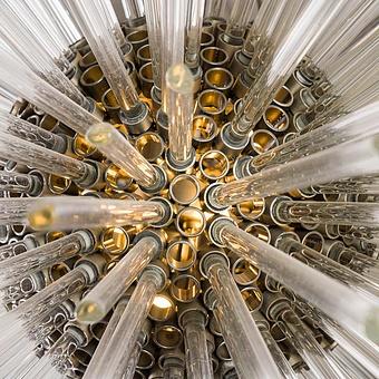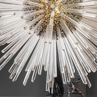 Умершая звезда? Элементарная частица? Люстра Эквалайзер оставляет широкий простор для фантазии. Девять винтажных лампочек накаливания окружены расходящимися стеклянными лучами в виде сплющенных трубок. В центре конструкции находится сфера из тёмного железа. Люстра станет ярким футуристическим акцентом в любом современном интерьере - от стиля хай-тек до эклектики. Её большие размеры (диаметр 120 см) позволяют размещать светильник в центре потолка гостиной или библиотеки.