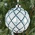 Шар из белого стекла с нежным голубым оттенком станет эффектным акцентом новогоднего декора. Его поверхность напоминает лёгкий снежный налёт, словно игрушка только что появилась из зимней сказки. Классический клетчатый узор, украшенный переливающимися бусинами, красиво играет в свете гирлянд, создавая ощущение магии и праздника.