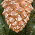 Эта шишка золотистого цвета, чуть прихваченная снегом, идеально смотрится на фоне зелёной хвои ёлки.