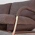 Сталь, покрытая матовой медью, красиво оттеняет вручную плетёную кожу табачно-коричневого оттенка. Комфорт мягкой спинки и удобного сиденья подчёркнут сложносочинённой обивкой, в которой кожа соседствует с бархатом. Изящные, аристократически изломанные линии ножек уравновешиваются плавностью мягких форм дивана. Всё вместе это рождает гремучую смесь под названием “Модерн середины века“ (Mid-century Modern). Стиль, который снова стремительно входит в моду.