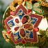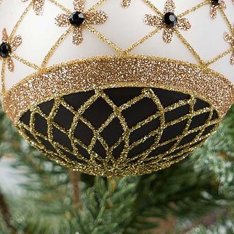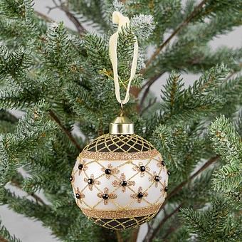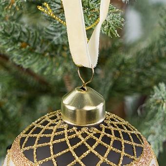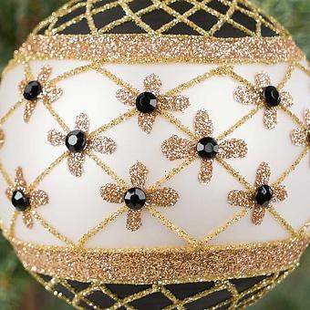 Стеклянный шар золотистого цвета, в котором отражаются еловые лапы, покрыт ярким выразительным узором в стиле Ар-деко. Эта ёлочная игрушка - броская, но выполненная с безупречным вкусом - обязательно притянет к себе восхищённые взоры ваших гостей.