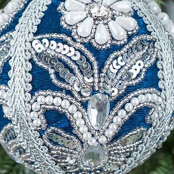 Синие новогодние шары - большая редкость, обычно они бывают красными или золотыми. Вышивка бисером придаёт этому шару восточный колорит. Борис Гребенщиков пел: “Золото на голубом”. Но золото на синем тоже очень красиво.