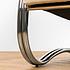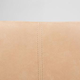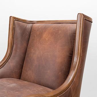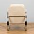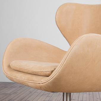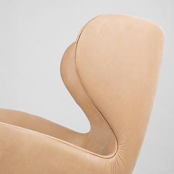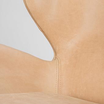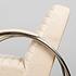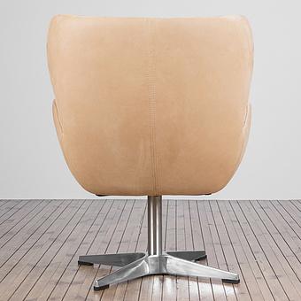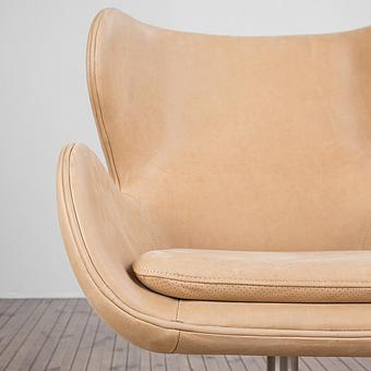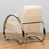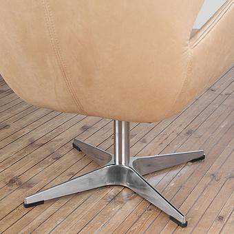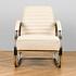 Обивка из натуральной кожи тёплого белого оттенка дарит ощущение уюта и утончённости, а плавные хромированные подлокотники, переходящие в изогнутые ножки-полозья, отсылают к эстетике ретро-дизайна. Кресло выглядит как арт-объект, но при этом абсолютно удобно и функционально.