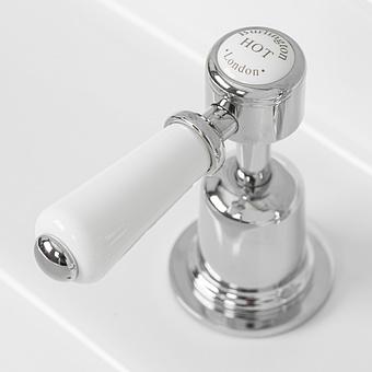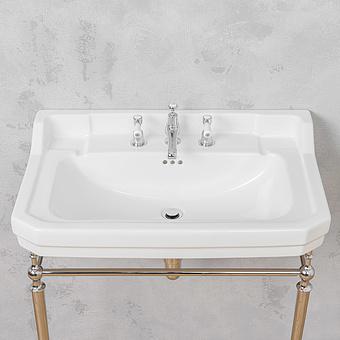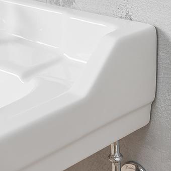 Форма раковины элегантно вытянута, предусмотрено отверстие перелива. Конструкция выполнена без отверстий под смеситель, что позволяет использовать настенный смеситель или смеситель с установкой на столешницу.
