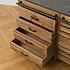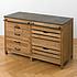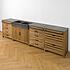 Гарнитур Карелия с двумя гранитными раковинами состоит из трёх модулей, идеально сочетающихся по размеру и стилю. Выполненный в духе скандинавского минимализма, он гармонично объединяет природную теплоту переработанной сосны с элегантной прохладой гранитных рабочих поверхностей.