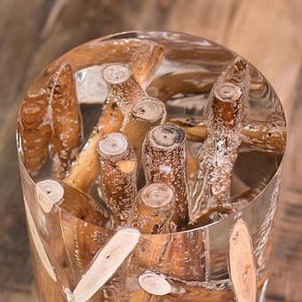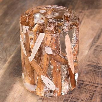Круглая светодиодная подсветка из алюминия, испускающая тёплый белый свет - идеальный компаньон для прикроватного столика, в котором ветки и коряги залиты прозрачным акрилом.