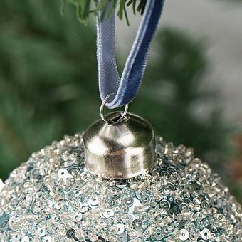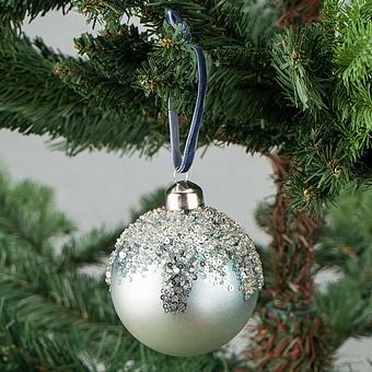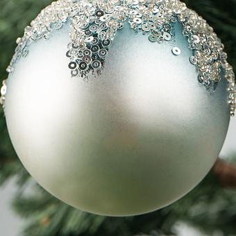 На небесно-голубом фоне рассыпаны сияющие жемчужины - стразы. У каждой из них, словно у кометы, золотистый хвост. Шар создаст совершенно особенное светлое настроение и подарит надежду на лучшее.