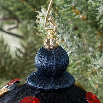 Ёлочная игрушка в виде красного креста с зелёной кисточкой производит впечатление изысканного украшения из ларца королевы. Тщательно выполненный крест благородного ярко красного оттенка, золотистый шар со стразами и великолепная пушистая зелёная кисточка - всё это придают декору помпезный и торжественный вид.