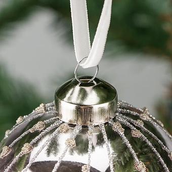 Красивый и элегантный шар будет отражать лучи новогодних огней. Золотистые нити и выпуклый рисунок представляют чудесный цветочный узор. Ёлочная игрушка в винтажном стиле может выступить как элемент интерьерной новогодней композиции или органично вписаться в каскад хвои классического зелёного, белого или синего цвета.