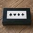 Чёрная шкатулка, выполненная из полирезина, имеет 3 отделения. В центральном углублении есть специальные выемки по краям, благодаря которым колоды удобно доставать и класть на место. На крышке шкатулки эффектно выделяются 4 масти карт в чёрном цвете на белом фоне. Вмещает 2 колоды карт формата “покер” и 5 игральных костей.