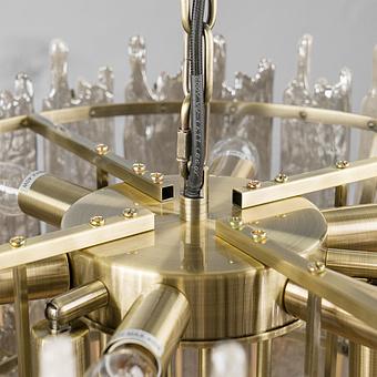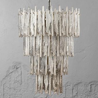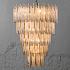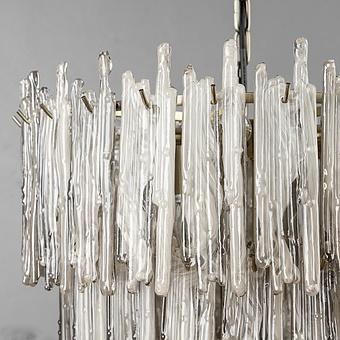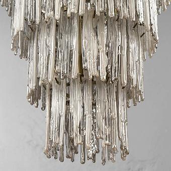 Впечатляющий конический светильник с пятью ярусами подвесок из дымчатого стекла перевернёт ваши представления о люстрах. Свет 17 лампочек рассеивается и дробится в стеклянных кристаллах, которые благодаря специальной обработке выглядят прозрачными сосульками. Стеклянное сооружение дополнено светлой матовой латунью.