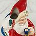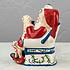 Санта уютно устроился, словно готовится выпить чашечку чая в хорошей компании. У него на голове сладко дремлет кот, а у ног — игрушечный конь-качалка, добавляя композиции уюта и сказочности.