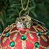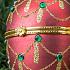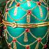 Два стеклянных яйца - красное и зелёное - декорированы золотистым узором и прозрачными бусинами. Они вызывают ассоциации со знаменитыми яйцами петербургского ювелира Карла Фаберже.
