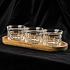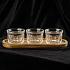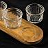 На небольшом подносе из дерева акации установлены три стеклянных веррина с тонкими рёбрами. В них можно элегантно сервировать оливки, слоёный мини-салат, гуакамоле.