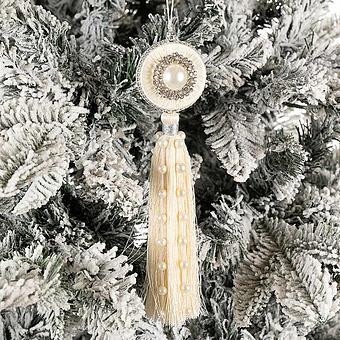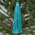 Новогодняя подвеска чудесного серебристо-голубого оттенка выглядит роскошно. Стразы в тон кисточки хорошо с ней сочетаются, а серебристые узоры добавляют торжественности.