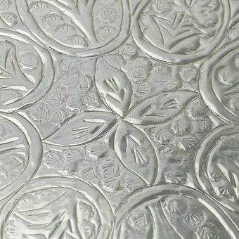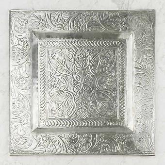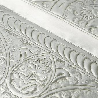 Стильное и оригинальное украшение в винтажном стиле с серебристым отливом металла выглядит элегантно и богато. Изысканный вид большому по размеру подносу придаёт прихотливо выгравированный растительный орнамент. Стилизованные листья и цветы вьются по поверхности подноса и придают ему неповторимый красивый объёмный образ.
