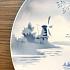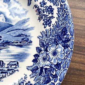 Винтажная тарелка с изображением березовой рощи и мельницы на берегу широкой реки.