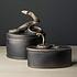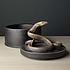 Изысканная круглая золотистая шкатулка в винтажном духе привлекает внимание. Фигурка змеи на крышке выделяется своим реалистичным видом, детальной проработкой и оригинальным дизайном. Изделие мастерски изготовлено из прочного и экологичного полирезина.