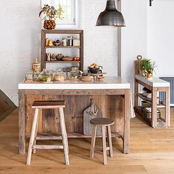 Предметы мебели из коллекции Greta соединяют в себе, на первый взгляд, несочетаемые материалы: грубоватую переработанную древесину и роскошный мрамор. Кухонный остров, консольный стол, стеллаж порадуют...