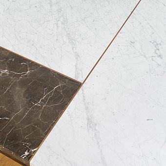 И правильно, ведь центром этой композиции стремится стать столешница из натурального мрамора. Графическую игру контраста между белым и цветным камнем отлично подчеркивает медная отделка.