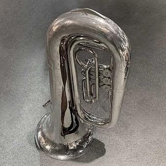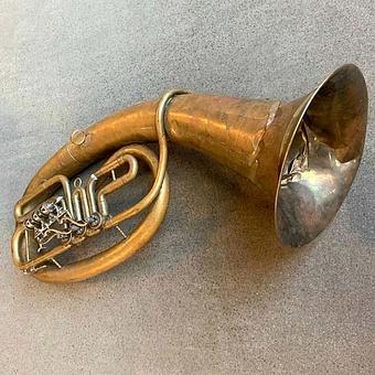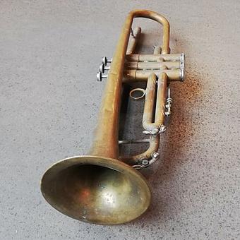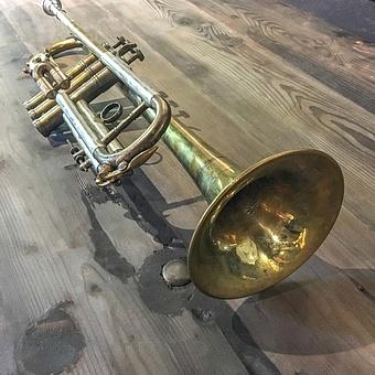 Труба звучит прекрасно как в симфоническом оркестре, так и в оформлении интерьера. Из этого уникального образца, кажется, ещё слышится яркий блестящий тембр, завораживающий слушателя с первых нот. Повреждения на корпусе и живописные разводы свидетельствуют, что этот инструмент активно использовался. Интересно, в каком оркестре можно было услышать его в прошлом?
