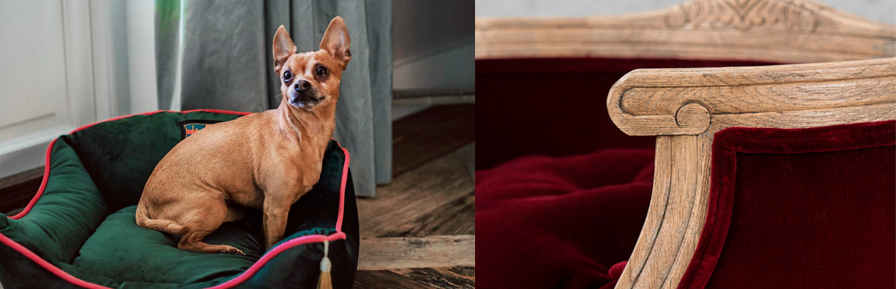 Используются классические дуб, бархат, крупный лён, с той лишь разницей, что ткани подушек и обивки пропитаны грязе- и водостойким составом Teflon®, что делает эти красивые модели еще и невероятно практичными. Кроме этого имеются необходимые любым домашним животным миски и подставки под них.