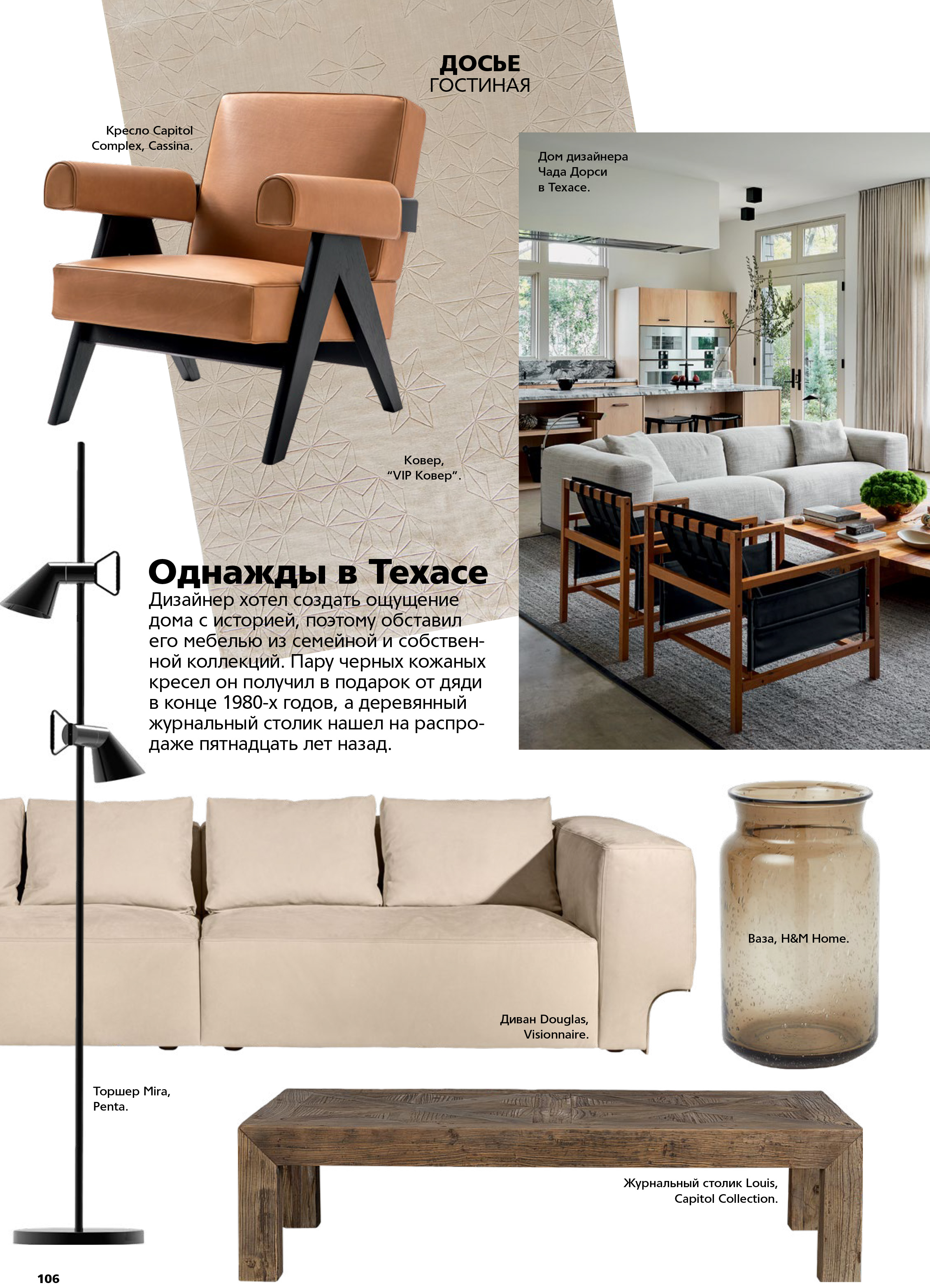 На фото в правом углу - гостиная Чада Дорси из его загородного дома в Техасе. Дизайнер хотел создать интерьер "с историей", используя винтажные вещи из семейной коллекции. Architectural Digest подобрал мебель и аксессуары, лучше всего передающие характер этого американского особняка.