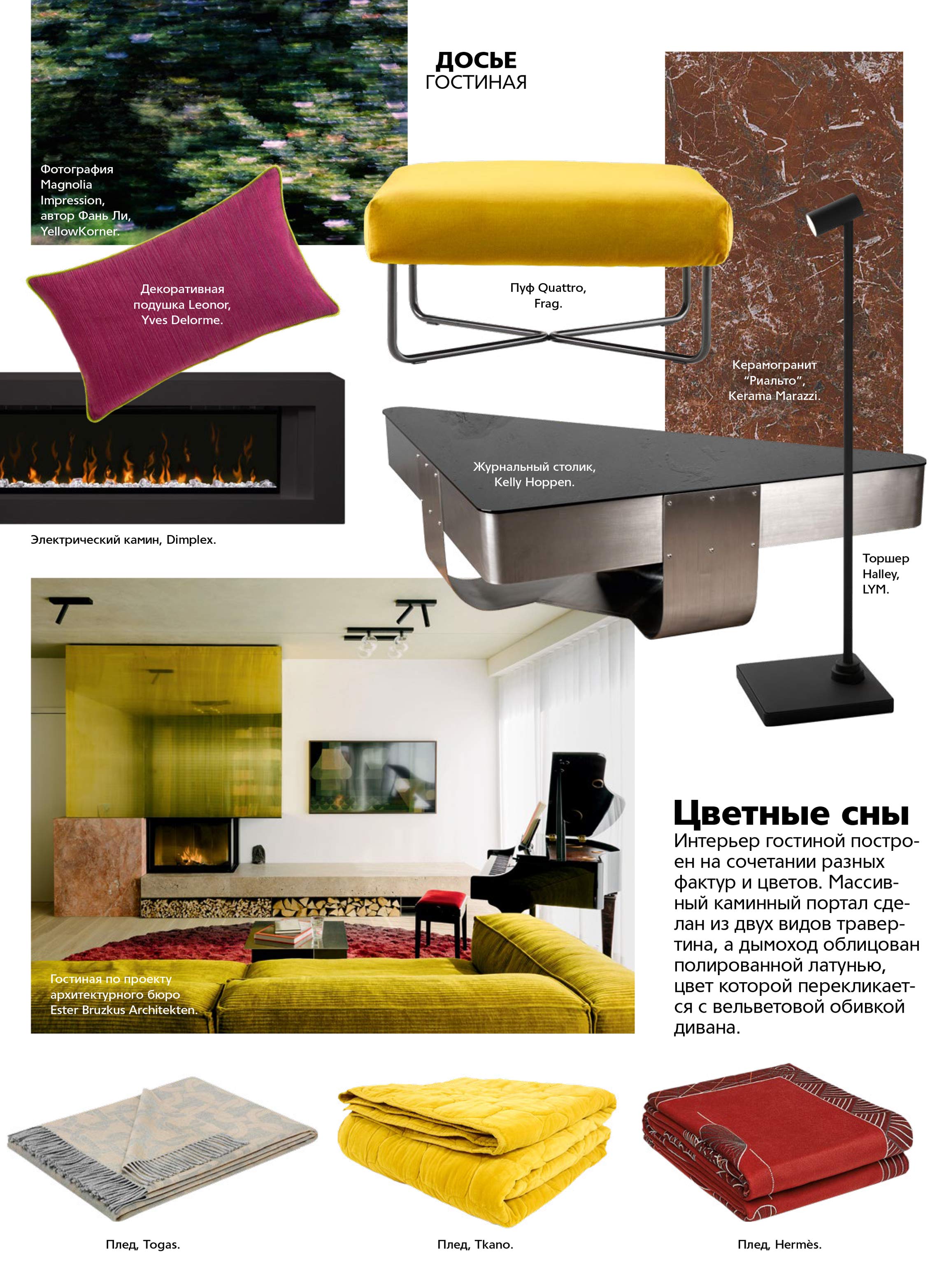 Гостиная, сочетающая разные фактуры и цвета, спроектирована архитектурным бюро Ester Bruzkus Architekten. Журнал Architectural Digest сделал подборку предметов, воссоздающую дух интерьера из этого проекта.