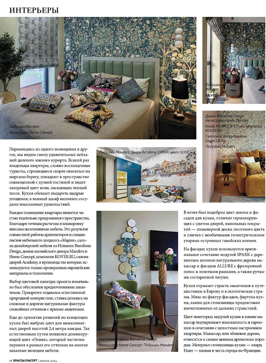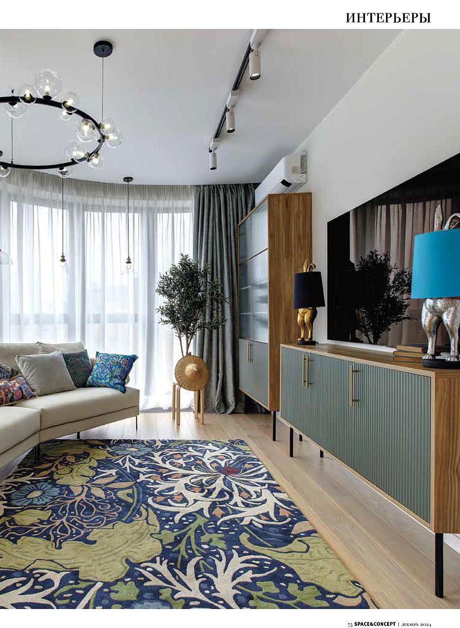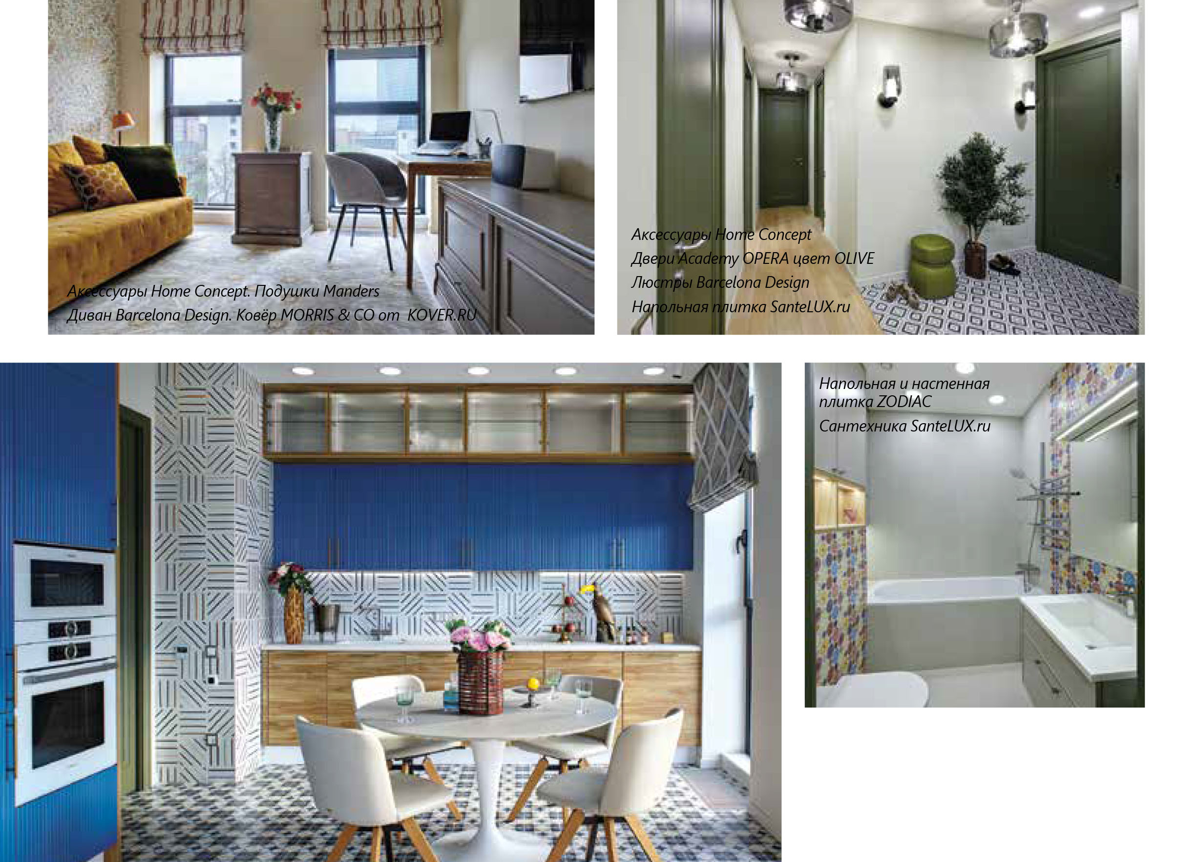 Сегодня среди серых бетонных джунглей мегаполиса как никогда хочется чувствовать в своей квартире тепло, яркие краски далеких стран и свежий морской бриз. Войдя в квартиру в жилом комплексе Bauman House с панорамными окнами, сразу ощущаешь простор и манящую негу оливковой рощи, раскинувшейся на средиземноморском побережье. Такой эффект достигается использованием сине-оливковой цветовой гаммы, интересных принтов на стенах и в текстиле, а также находок из Home Concept: точной ботанической копии оливы, настольных ламп Робкий Кролик разных цветов, различных ваз и посуды.