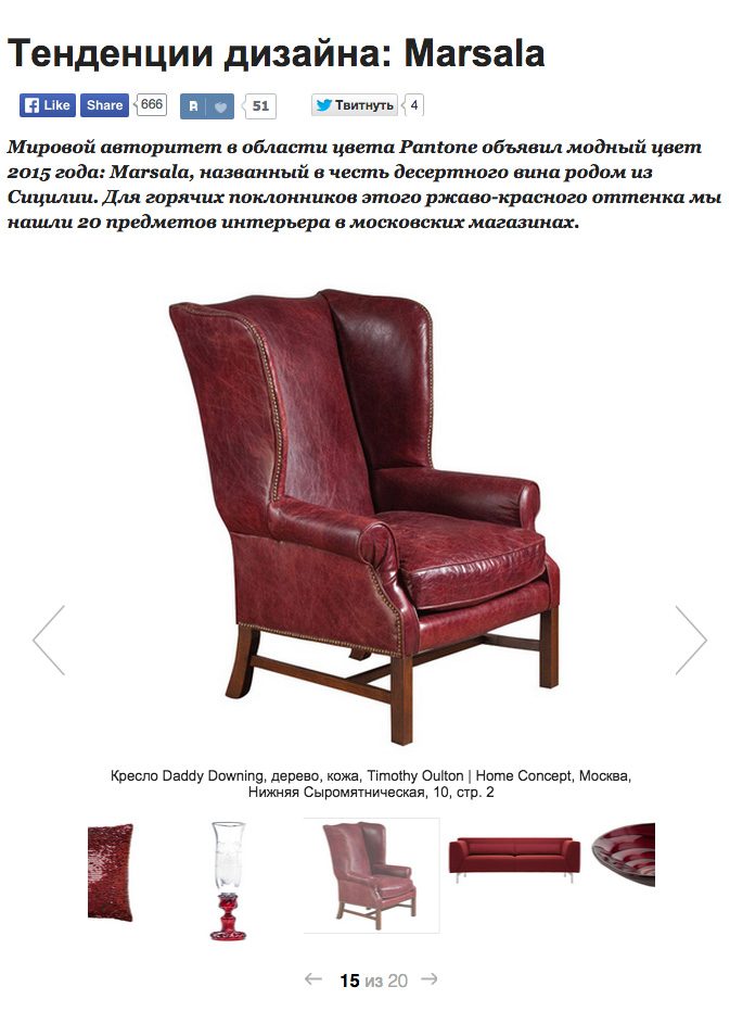 Кресло Daddy Downing и бра Applique Monte Et Baisse в модном цвете 2015 года по версии сайта Architectural Digest